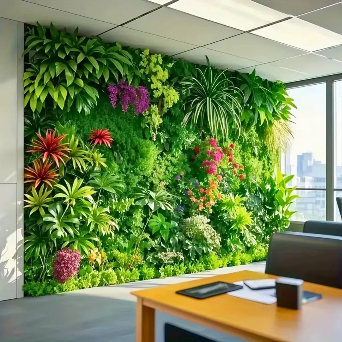 Transforme seu espaço com o Jardim Vertical Artificial com Flores e Plantas e desfrute de um ambiente verde e vibrante o ano todo, sem esforço.