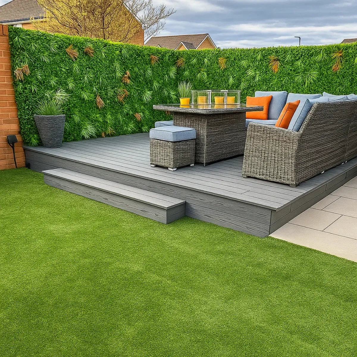 Os Painéis de Grama Artificial de Parede são feitos de polietileno reciclável (HDPE), garantindo uma vida útil de 5 a 8 anos.