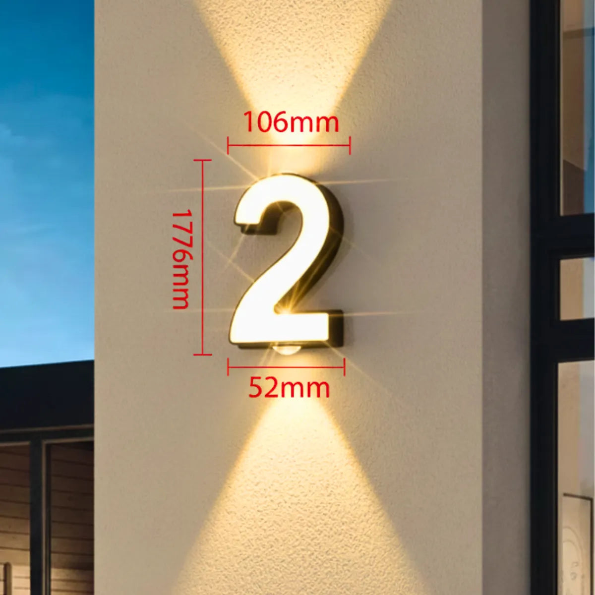 A iluminação bidirecional projeta feixes de luz para cima e para baixo, destacando o número com elegância discreta.